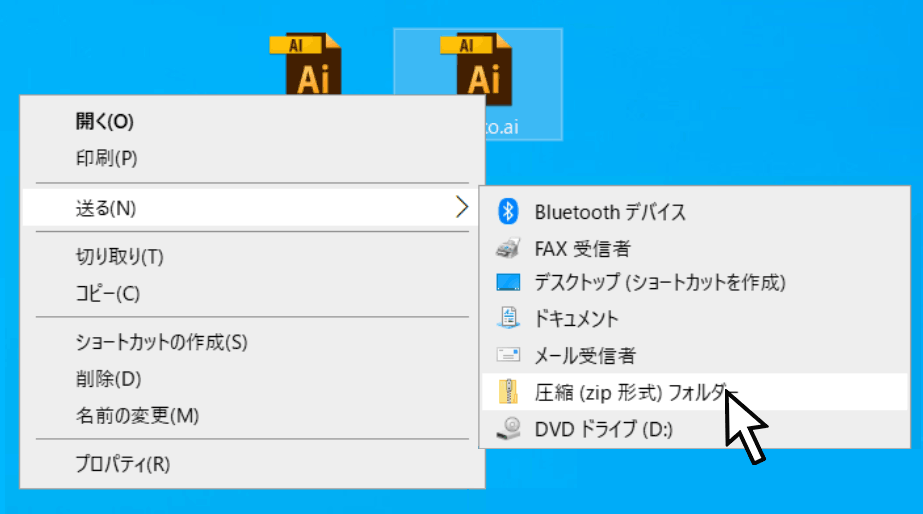 2,ファイルの上で右クリックを押して出るメニューの「送る」をクリックして、その後に出るメニューの「圧縮(zip形式)フォルダー」をクリックする